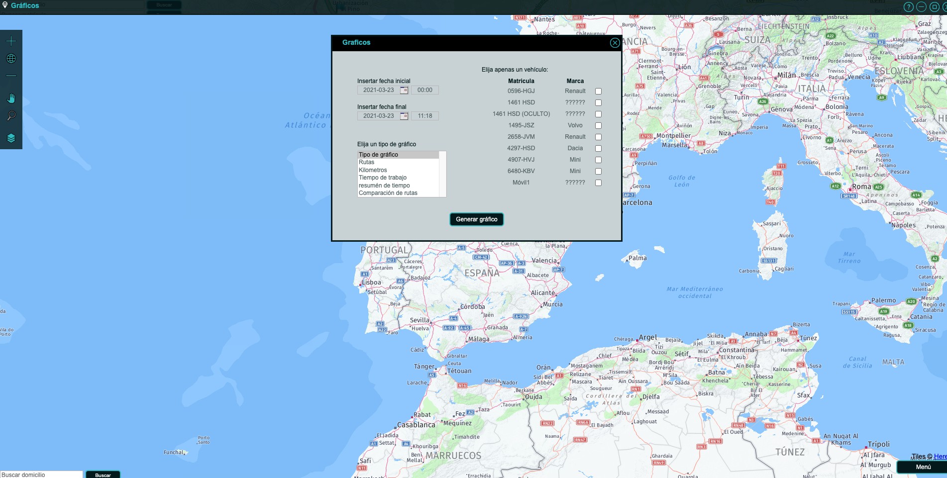 Podrás ver en un gráfico toda la información referente a los vehículos que elijas y en el período de tiempo seleccionado. Con todo lujo de detalle, velocidad máxima, mediana, duración de los trayectos, kilómetros recorridos y el estado del vehículo en cada momento.